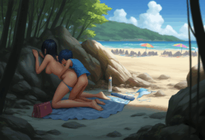 girl, {{black hair,::,medium breasts,bikini ,nsfw,sex from behind,A girl having sex,nippples,clothed sex,rocky seashore,lotion_bottle,{{handbag_on a beach towel, one unworn_bikini_top_on a beach towel,water_bottle:: ,coastal rocks, crashing waves, sea spray, wet stones,{{forest,nature,tree_shade,hiding behind the rocks::,{{all fours,doggystyle ::,,nsfw, topless,nipples,{bikini_bottom_pull ::,